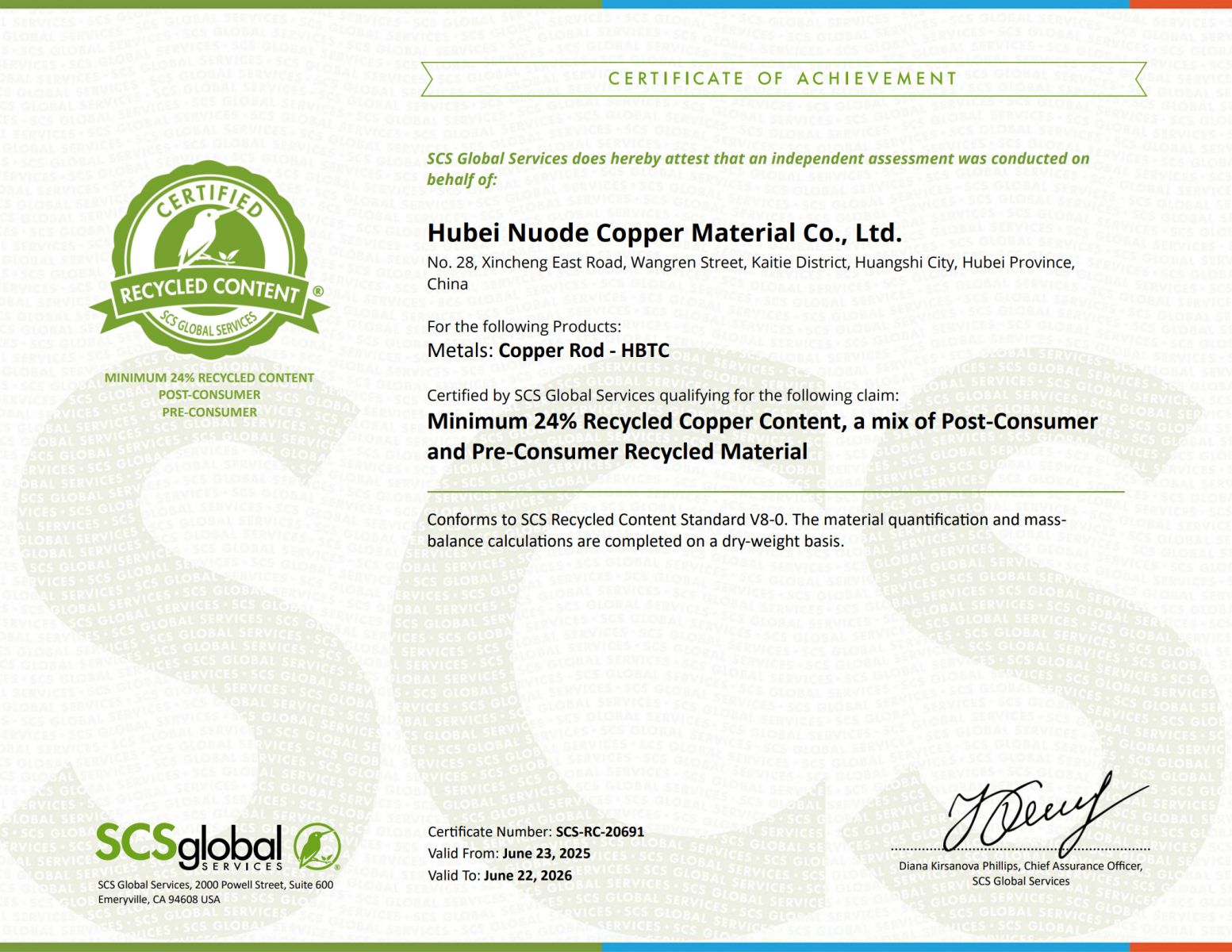 近日,经全球权威认证机构SCS Global Service(美国全球科学认证体系)的严格审核,华体会网页版旗下湖北诺德铜材有限公司的铜杆和铜线产品,成功获得翠鸟认证(SCS Recycled Content Certification)。该认证验证其产品中含有不低于24%的回收铜材料。